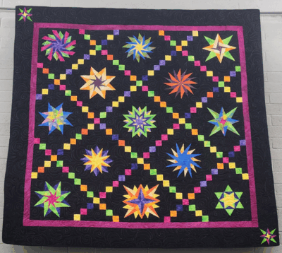 This was Sheryl’s first and last paper-pieced pattern which started in a class she took. She finished it